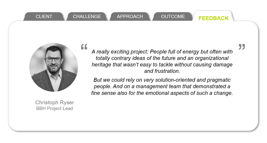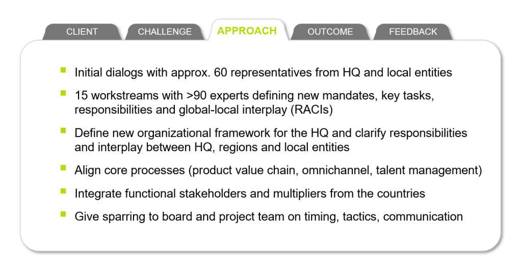 In the months before the new CEO took over, the company was shaken a bit due to some harsh HQ decisions and disappointments with the implementation of large corporate transformations. The decision to choose BBH for this task was therefore not only content-driven but at the same time motivated by our general credo to always focus on the people, also when a re-definition of structures, processes and mandates is about to take place. The selected approach clearly reflects this attitude from the very beginning: Define the to-be organization by understanding the characteristics and specifics, by working closely with the people affected and by finding a good balance of HQ expectations and reality of the local business.