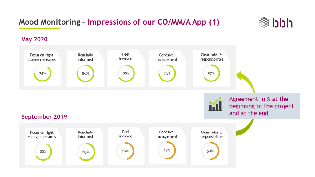 In the project mentioned, it was one of the success factors to permanently keep an eye on the employees’ mood & mindset and to derive suitable change measures, leadership impulses and communication content. As a result, we were able to ensure that all aspects developed positively over a period of 9 months.