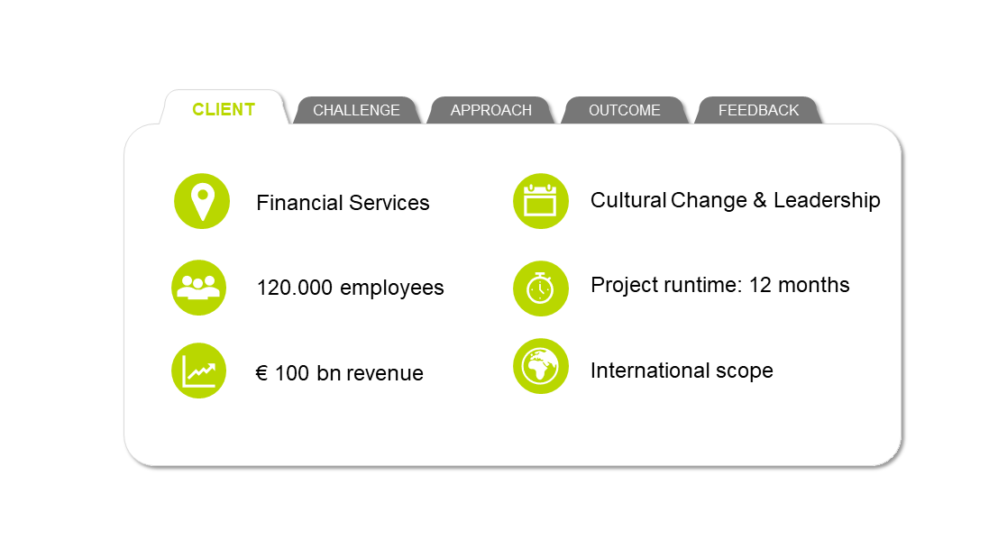 In the course of a cultural transformation at a large financial service provider the development of a common understanding of leadership was focal. In particular, this project was about making the challenges clear which leaders face because of the growing changes in the world of work and supporting the leaders with their development.