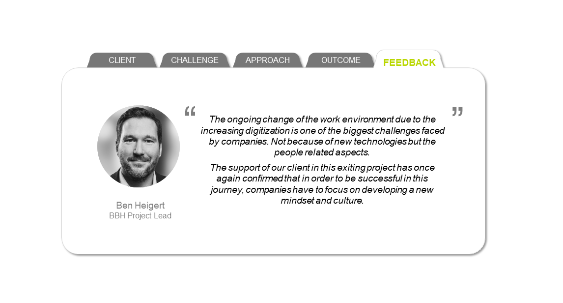 Based on that, we drew up a position- and strategy-specific 360-degree feedback for all leaders. Purpose of this process was that all leaders develop towards the basic skill sets and behavioral characteristics defined and especially that they provide specific leadership and change impulses in their sphere. The interventions from the 360-degree feedback were individually supported by BBH together with the respective supervisor. To ensure a lasting positive development, quarterly reviews in the form of “mini-pulses” were used.